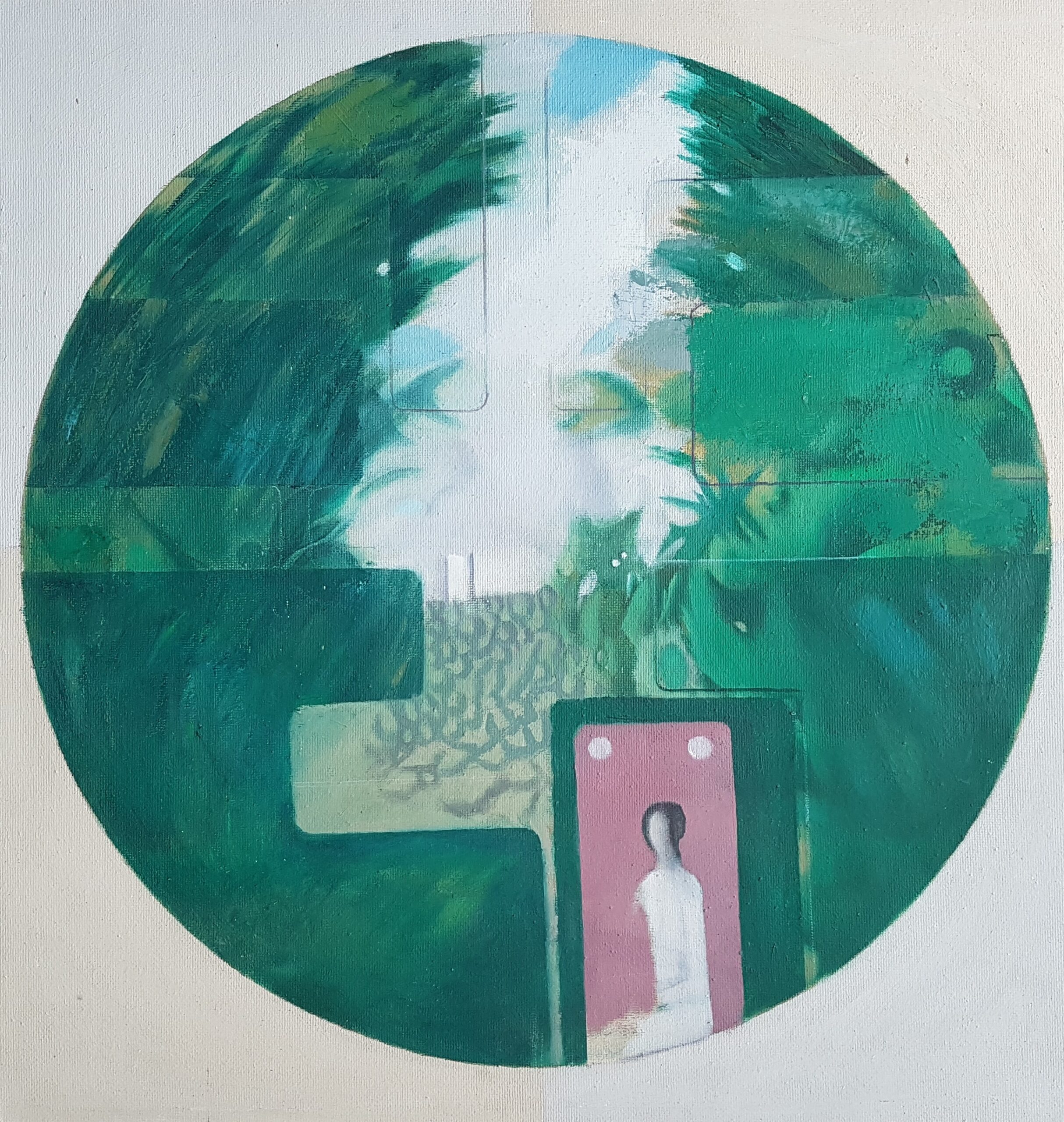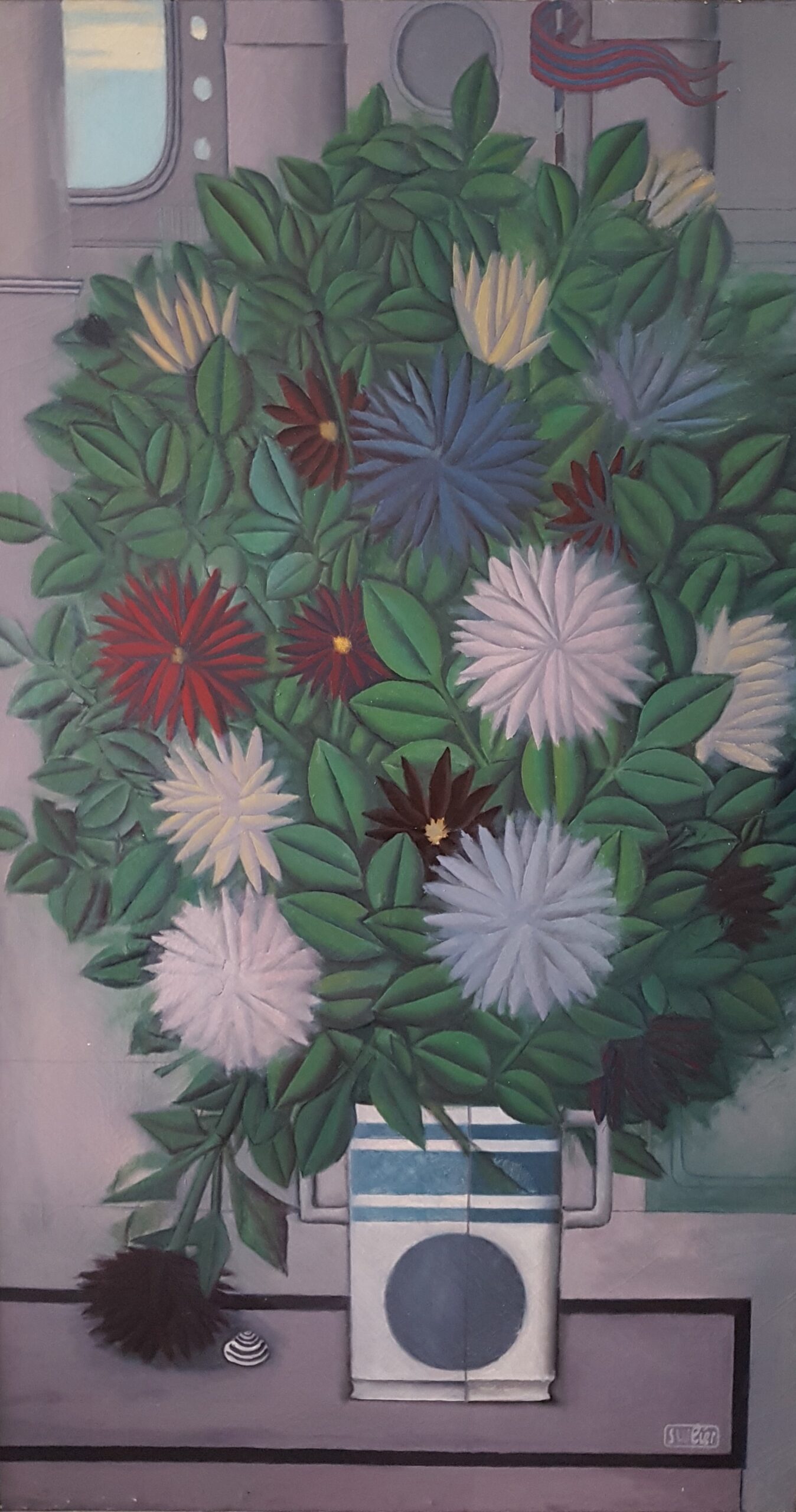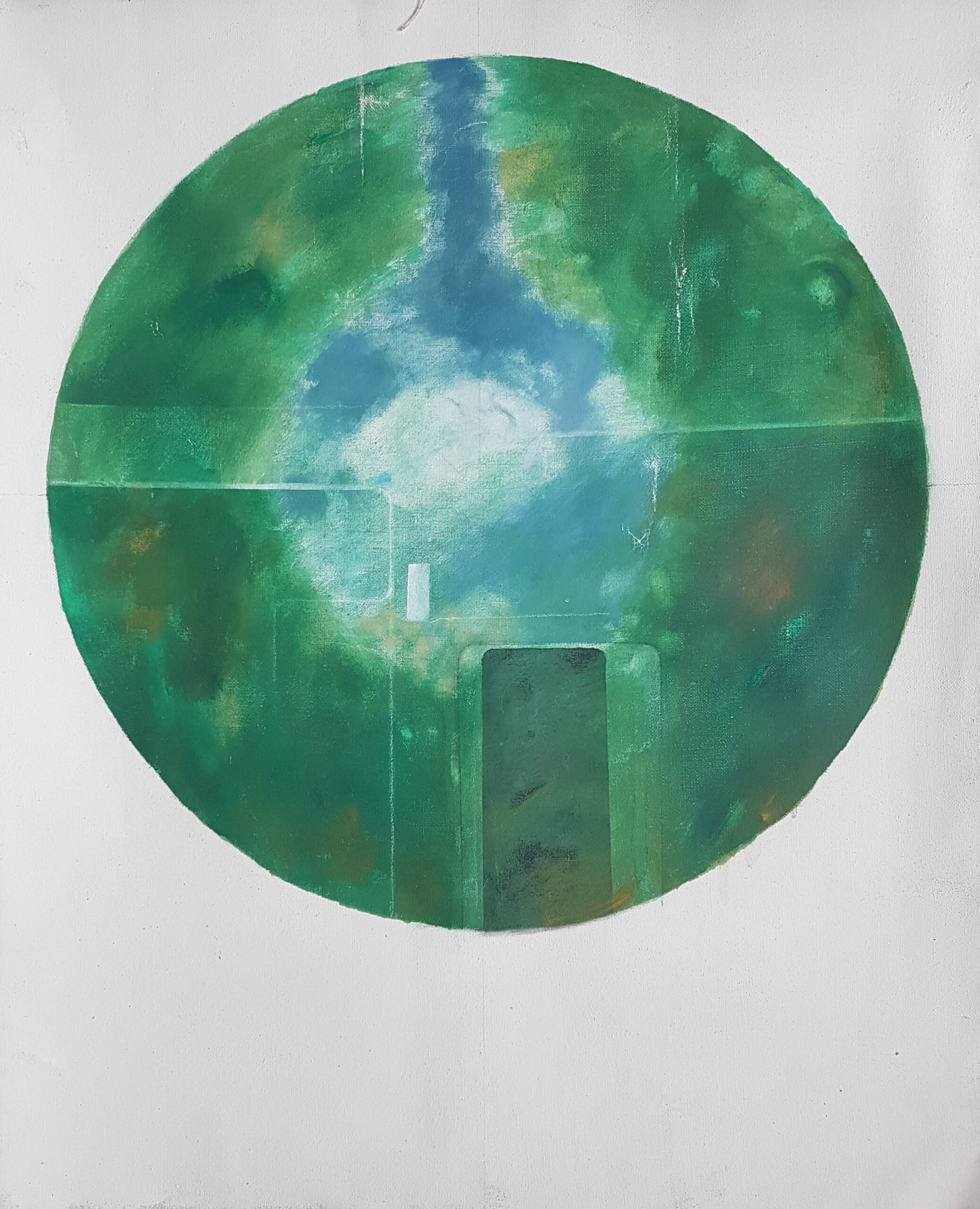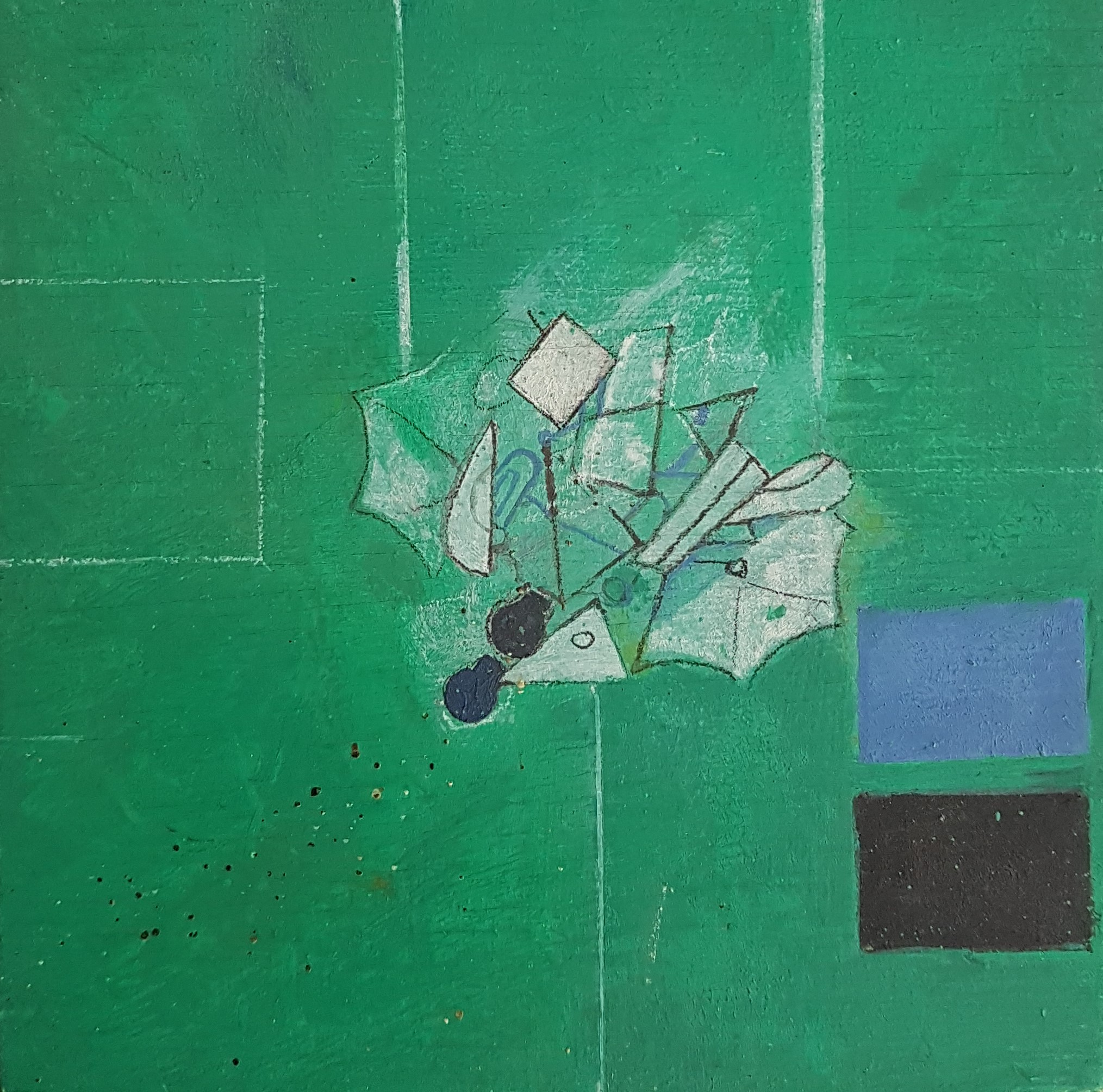19,6 x 20,8 cm, Mischtechnik auf Sperrholz, Rozès, 1989Weisse Maschine auf grünem Grund