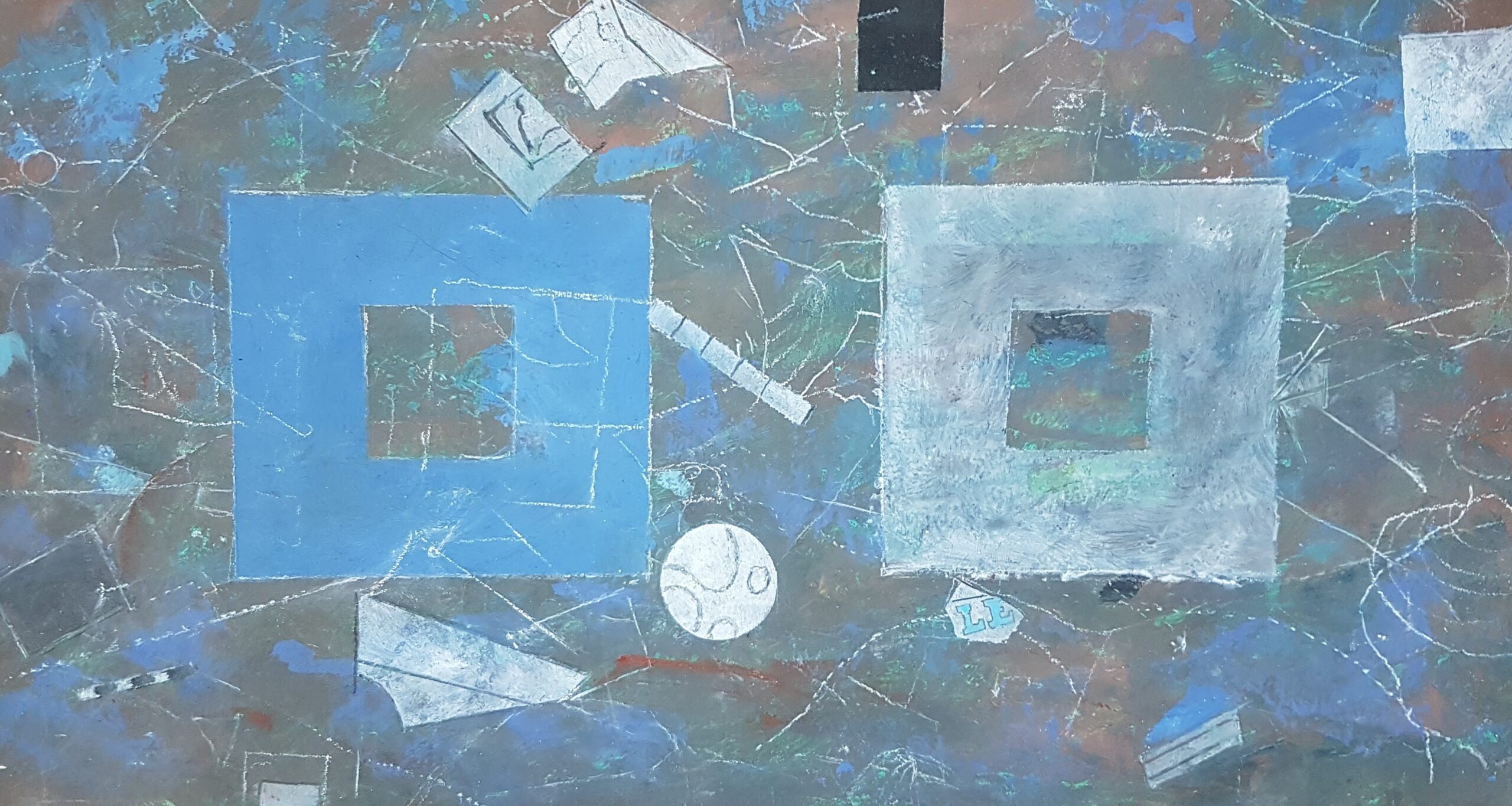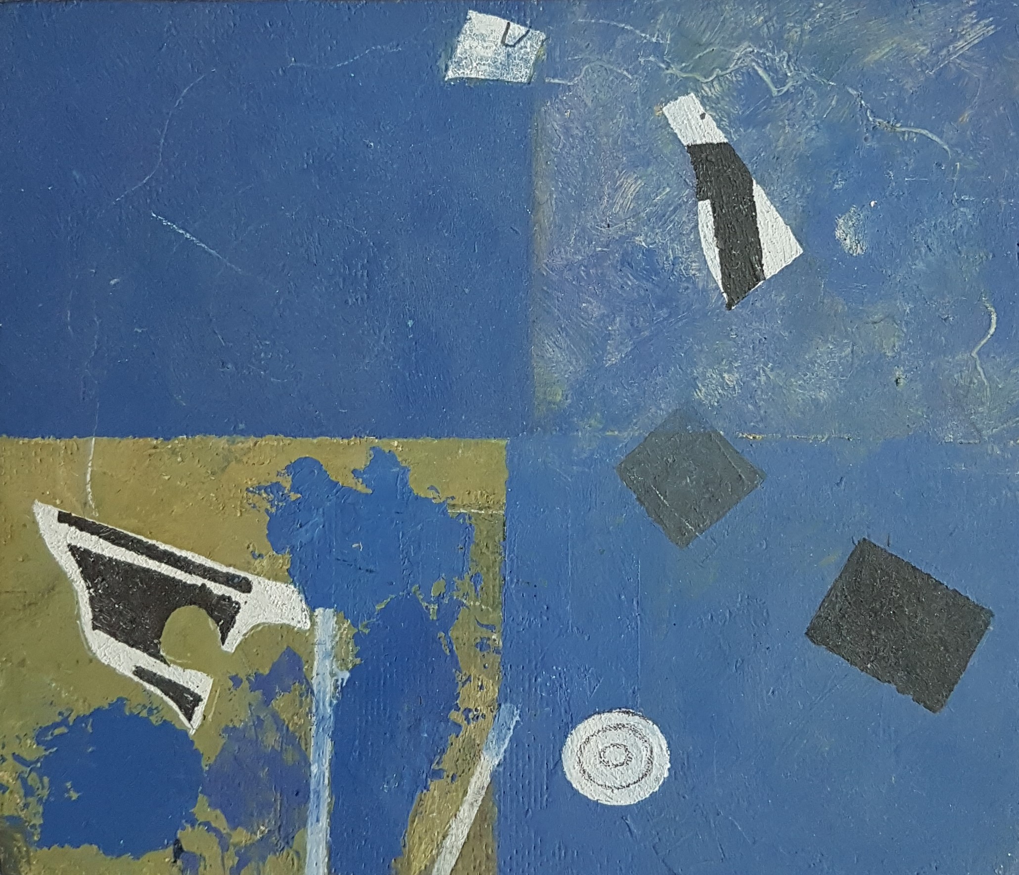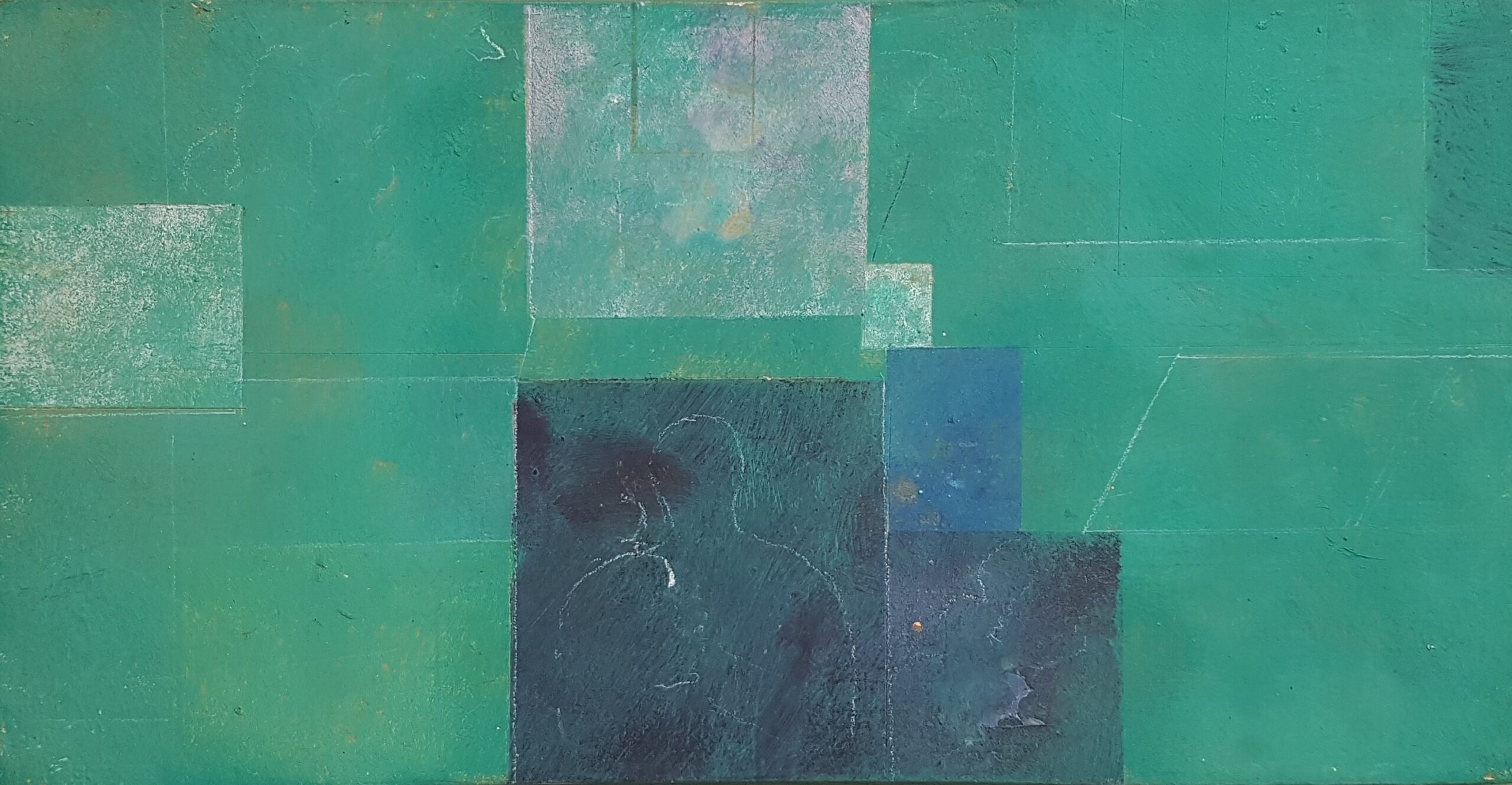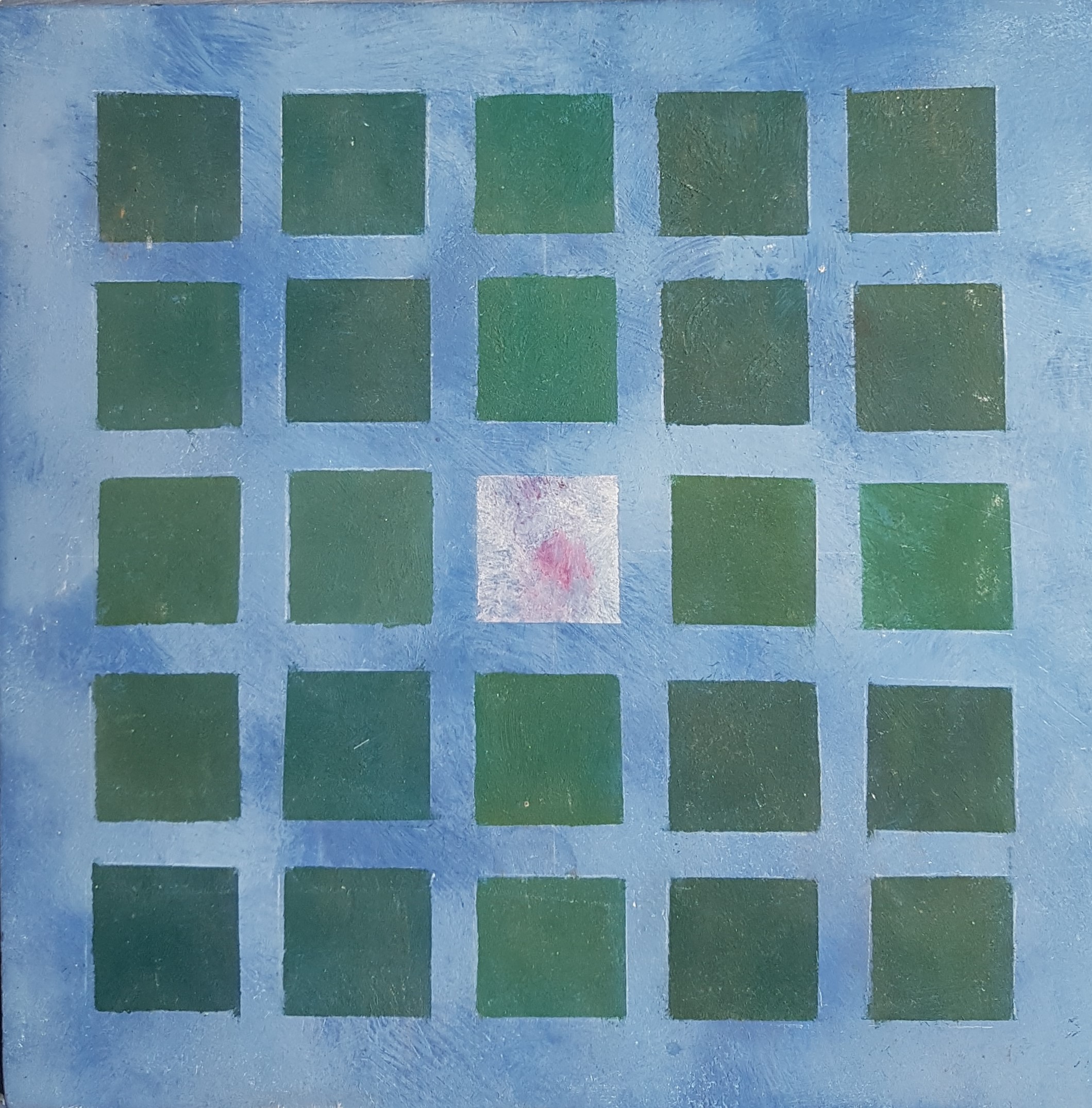 33,6 x 15 cm, Mischtechnik auf Contreplaqué, Rozès, 1994Meditationsbild, 14,7 x 14,7 cm, Mischtechnik auf Contreplaqué, Rozès, 199425 Quadrate auf blauem Grund, 21,9 x 21,9 cm,