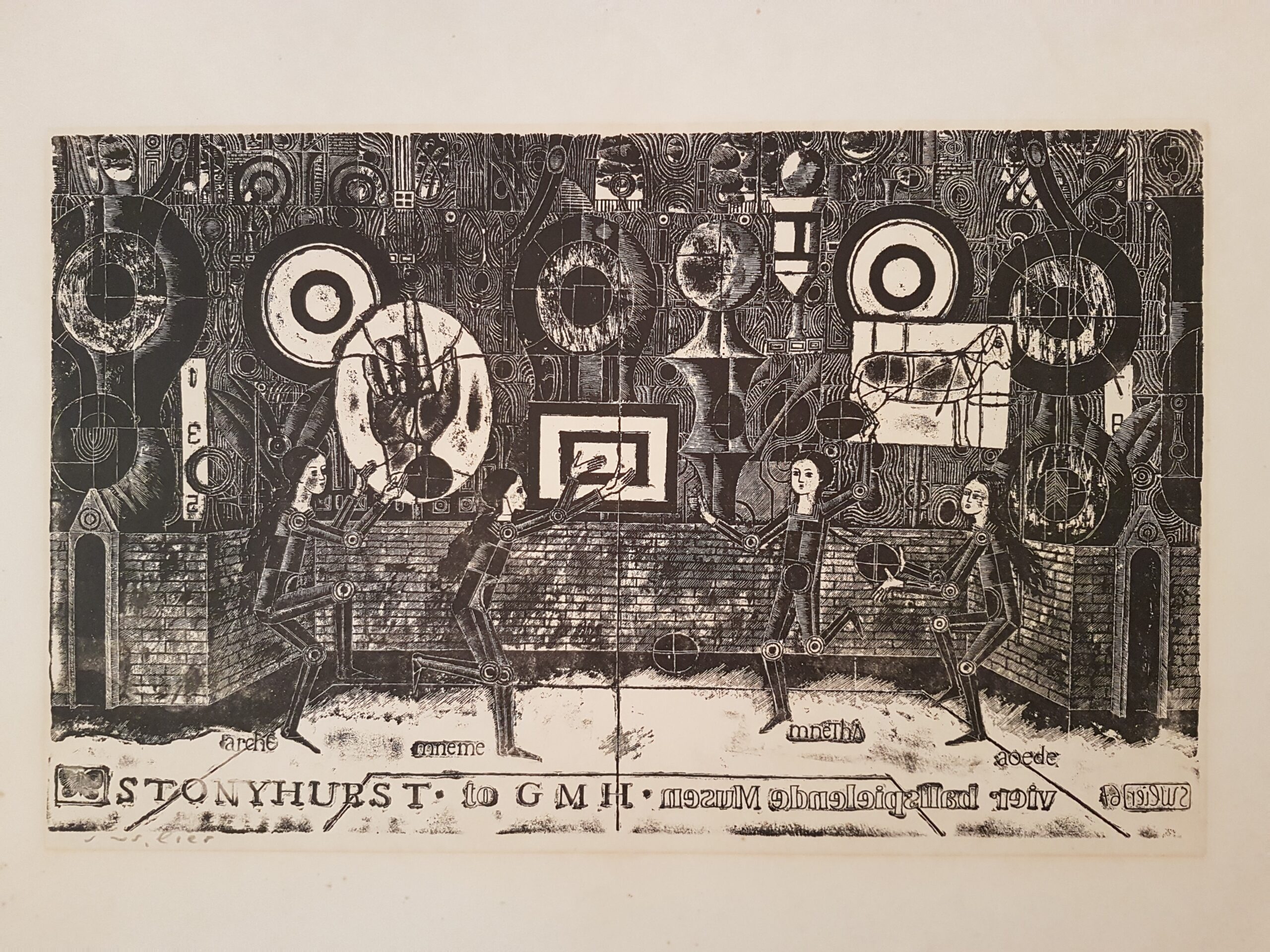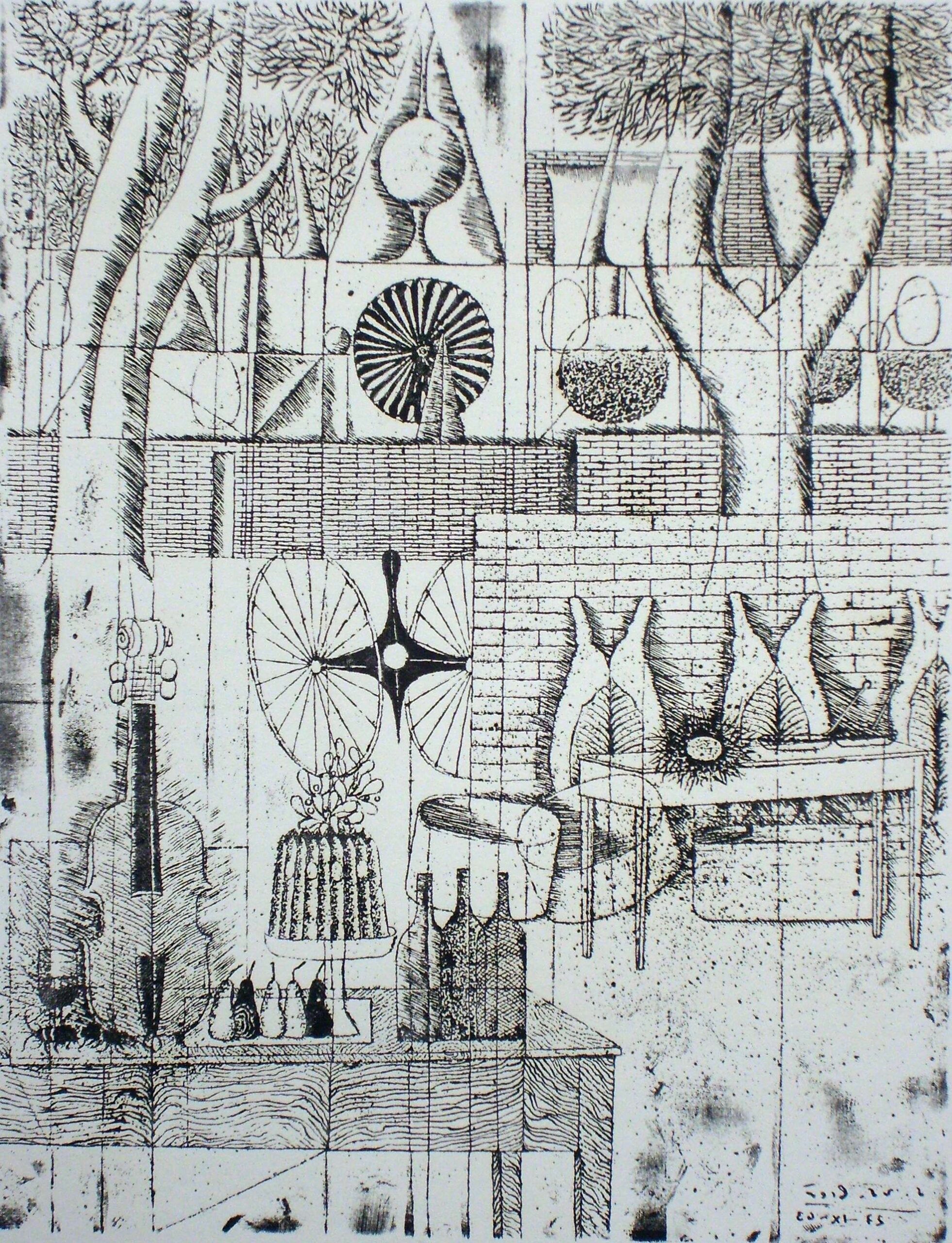 Stonyhurst, Kathedrale mit vier Mädchen – Hommage à Gerard Manley Hopkins, Handätzung, 28 x 46 cm, Pedrinate, Mai – Juni 1967, ausgestellt 3. Biennale für Grafik in Krakau