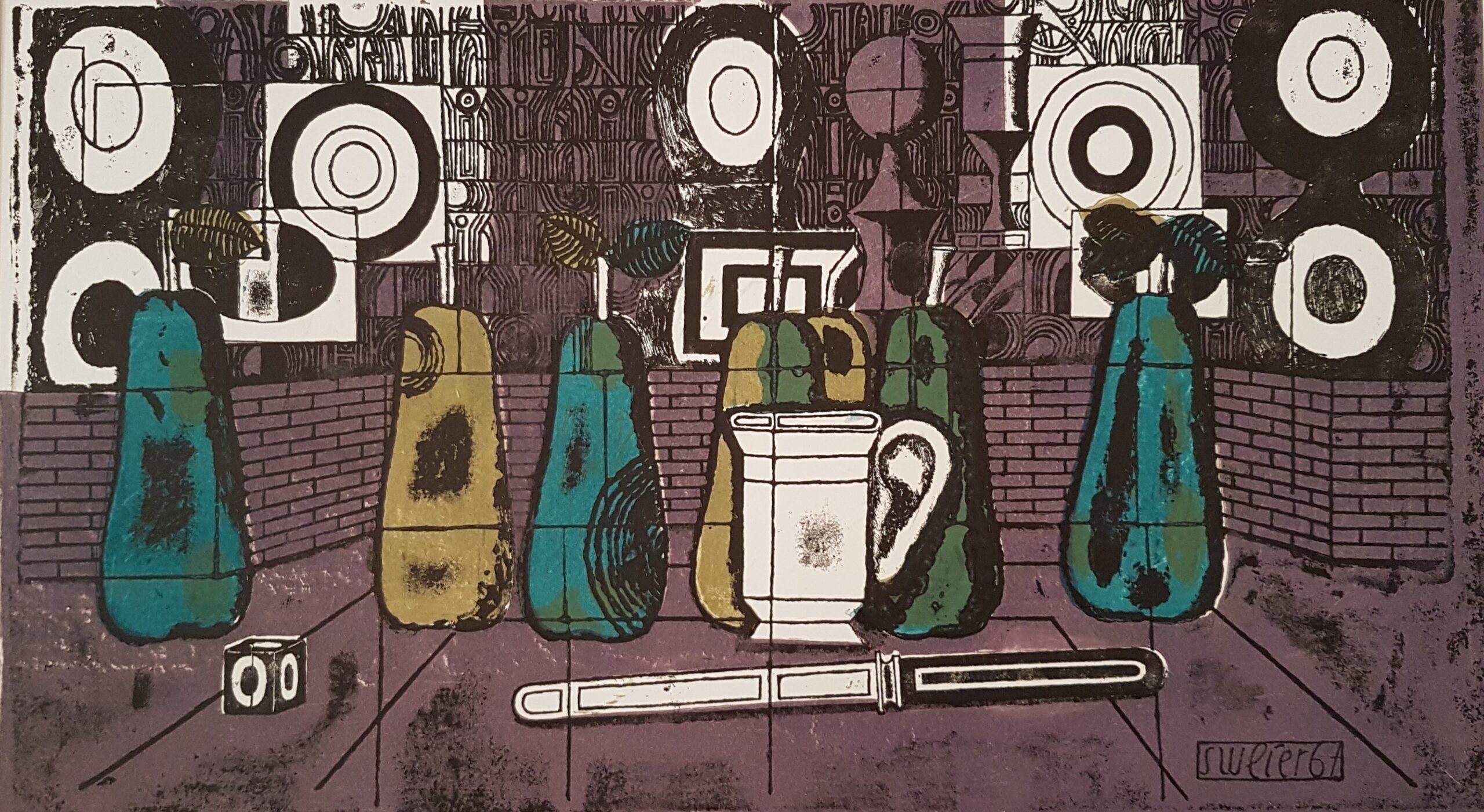Birnen vor Kathedrale, Handätzung und Linol, 25,5 x 46,3 cm, Pedrinate, September 1967